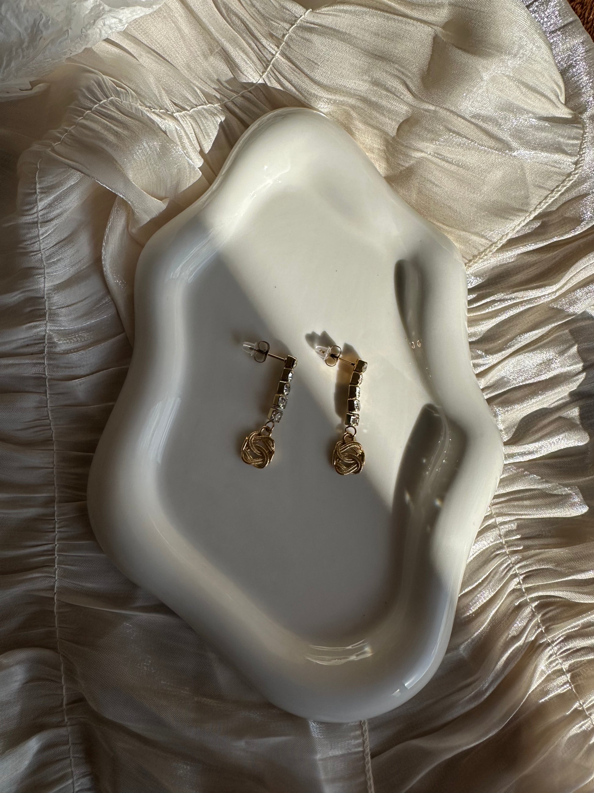 Illuminez vos looks avec les Boucles d’Oreilles Éclat Royal, une pièce élégante qui allie la brillance des cristaux scintillants à la finesse d’un pendentif doré en forme de nœud raffiné.