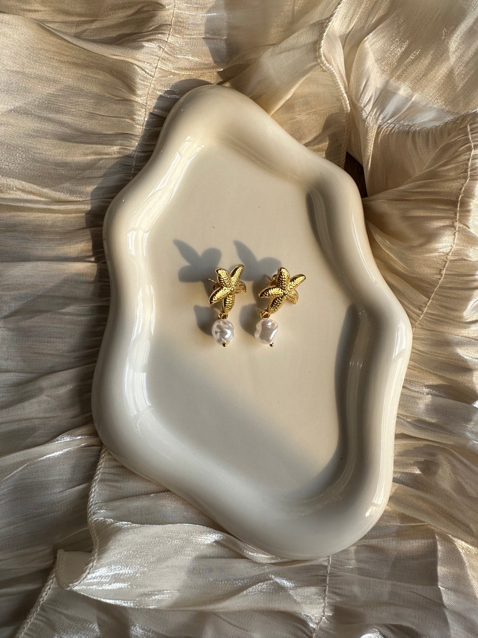 Les boucles d’oreilles Étoile Perlé évoquent les profondeurs dorées d’un lagon tranquille. Inspirées de l’étoile de mer, elles arborent une structure martelée en acier inoxydable doré, sublimée par une perle nacrée en pendentif.