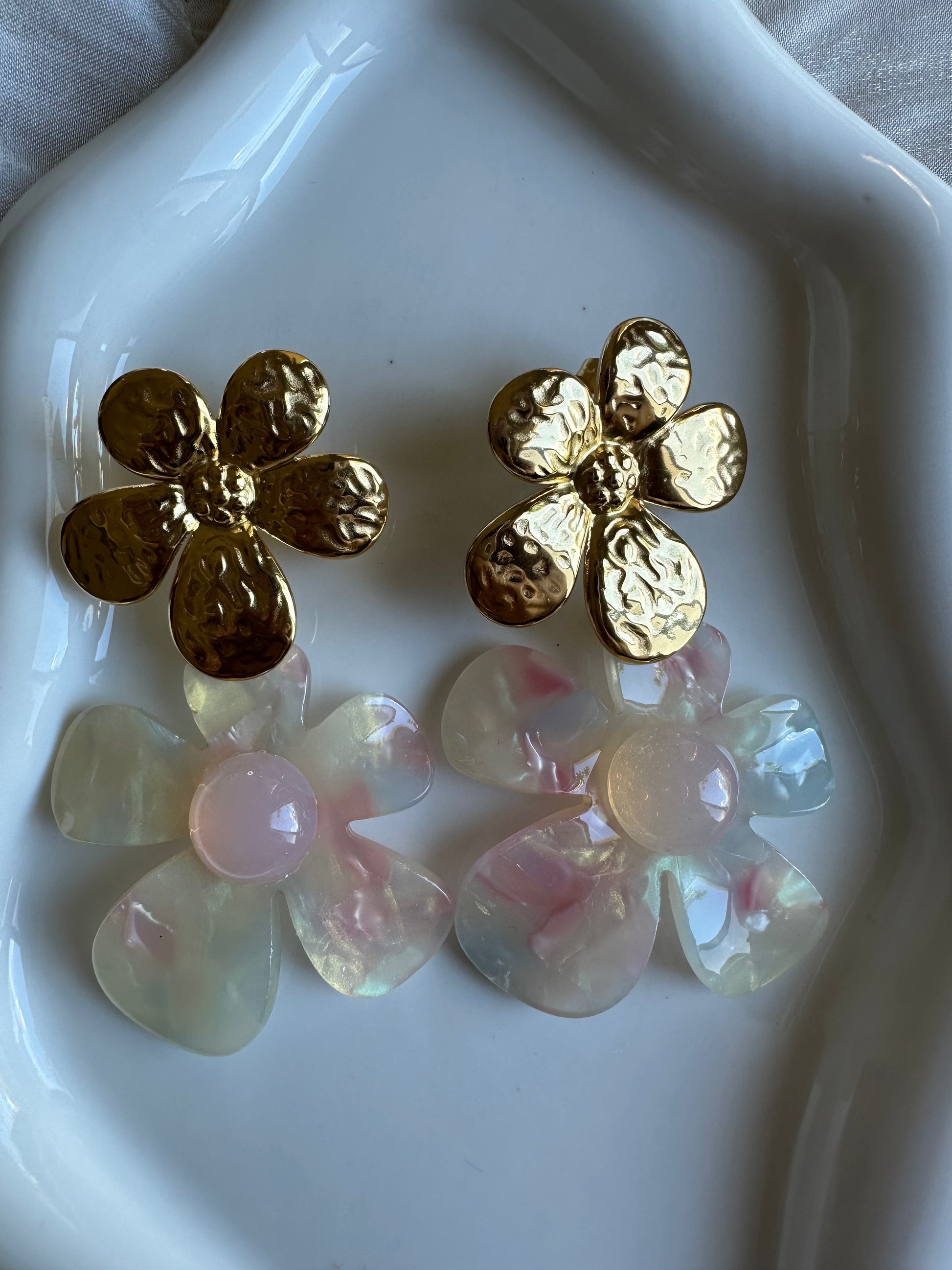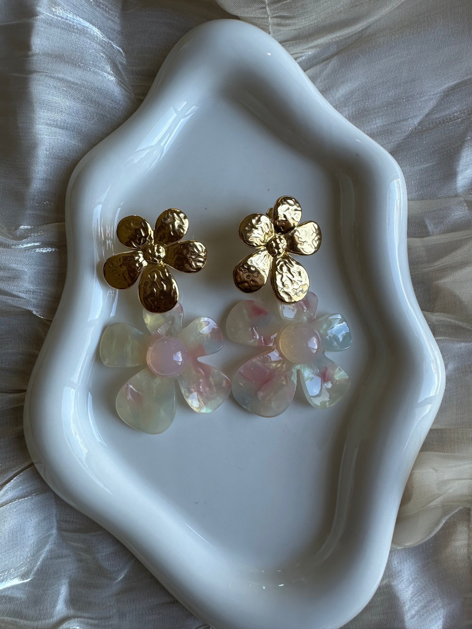 Un design unique en forme de fleurs mêlant un délicat effet martelé doré et des pétales aux nuances nacrées pastel.