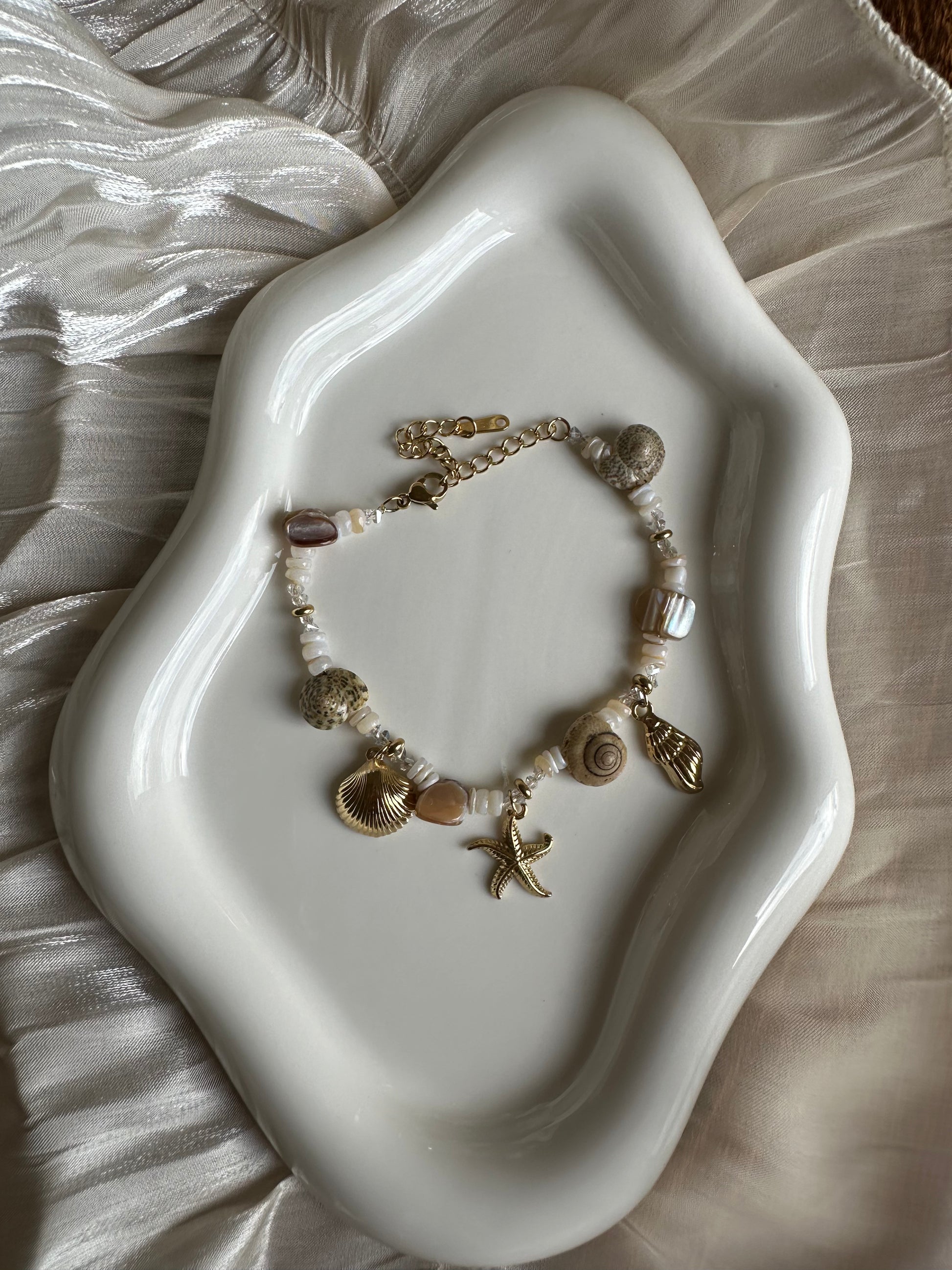 Apportez une touche estivale et raffinée à vos tenues avec le bracelet Océan Étoilé. Inspiré par la beauté des plages et des fonds marins, ce bracelet élégant associe des coquillages naturels, des pierres polies et des charms dorés en forme d’étoile de mer et de coquillages. Son style bohème chic en fait un accessoire parfait pour vos looks de tous les jours ou vos escapades au bord de mer.