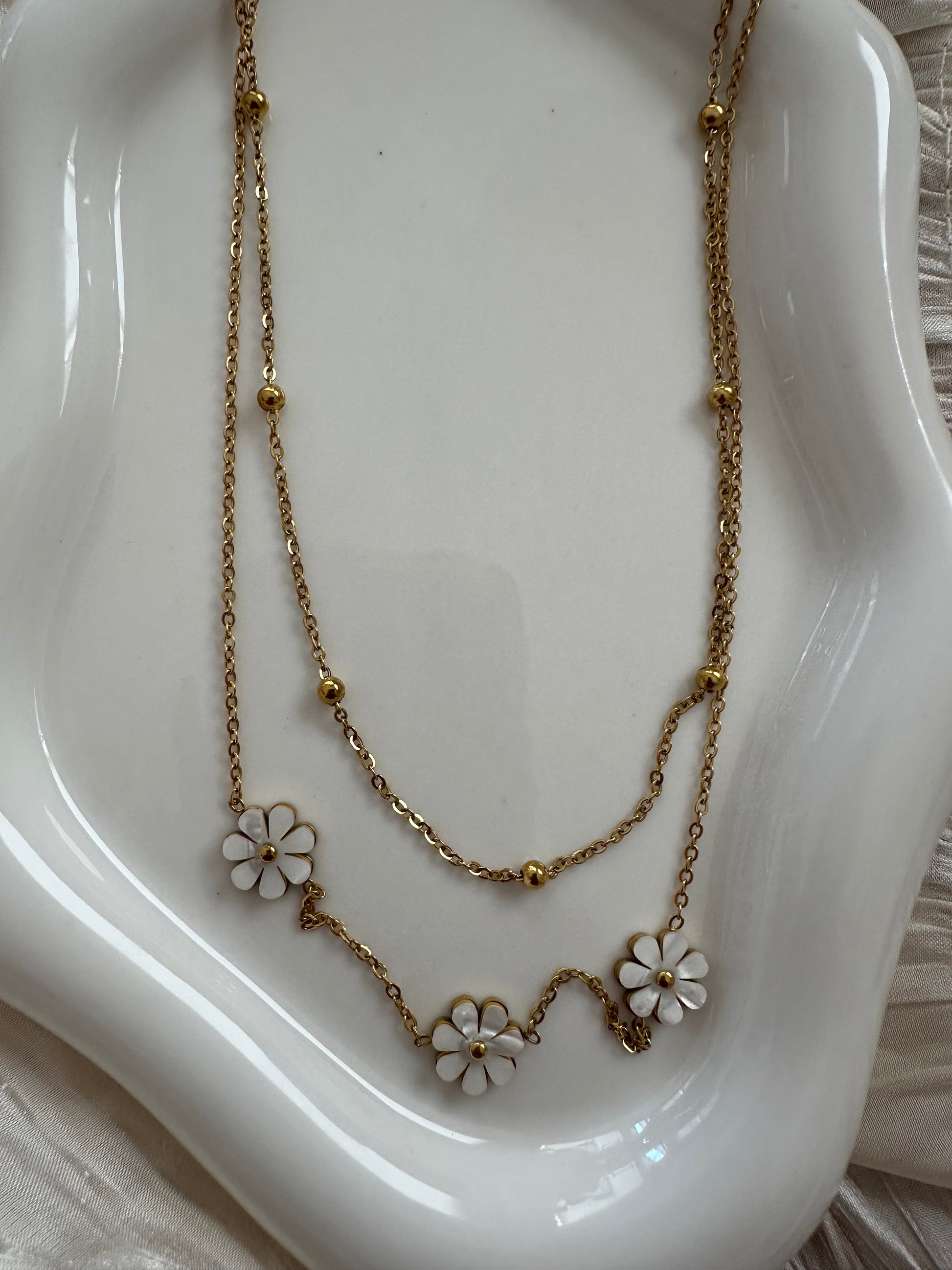 Ajoute une touche florale et romantique à ton look avec notre collier Douce Marguerite, un bijou délicat en acier inoxydable doré orné de trois fleurs blanches nacrées. Ce collier à double chaîne fine est à la fois élégant et intemporel, parfait pour sublimer toutes tes tenues, du quotidien aux occasions spéciales.
