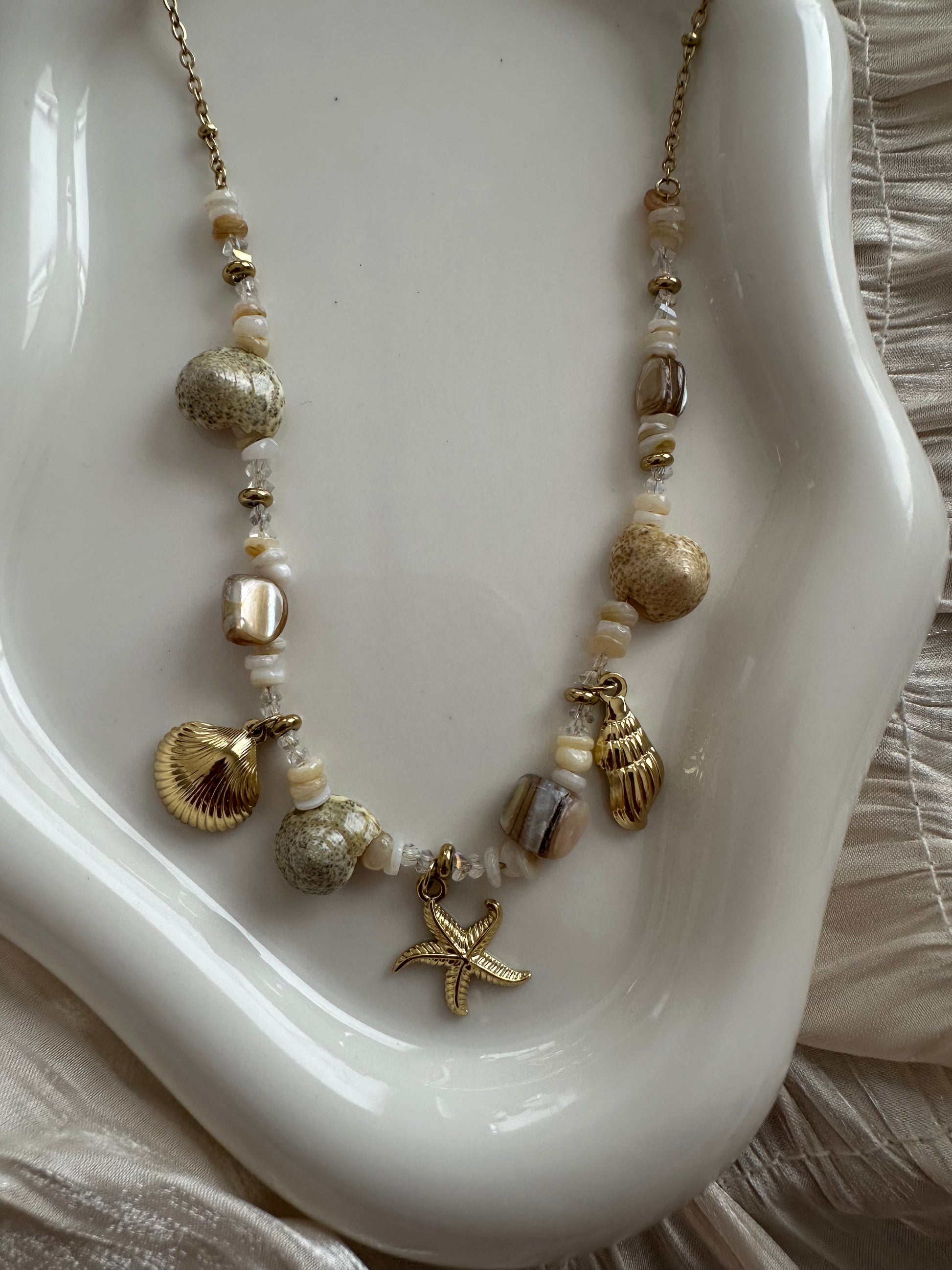 Laisse-toi emporter par la douceur des vagues avec le collier Éclat d’Écume, une pièce inspirée de la mer, mêlant coquillages dorés, perles naturelles, pierres nacrées et une délicate étoile de mer. Un bijou à l’allure bohème chic, idéal pour sublimer ta peau dorée en été comme en hiver.